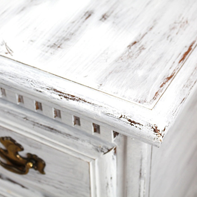 - When final coat of Beta Chalk Paint has dried completely, sand or rub protruding areas of furniture using a fine foam sandpaper (P240 – P320) or using red (very fine) or green (ultra fine) cleaning and finishing pads to expose the base colour applied. This works best on areas of the furniture that would naturally suffer wear and abrasion such as chair legs, backs and edges, the areas around handles and knobs and tops. Depending on the chosen type and roughness of sanding material, a different look may be achieved – smooth distress marks resembling natural wear or scratched distress. A combination of techniques may be combined to achieve the desired look.